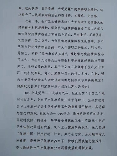 2022年是黨的二十大召開之年,也是落實“十四五”規(guī)劃關(guān)鍵之年,全市衛(wèi)生健康系統(tǒng)廣大干部職工,堅決貫徹落實習近平總書記關(guān)于衛(wèi)生健康工作的重要指示精神,高揚理想信念的旗幟,堅定勇毅篤行的信心,銘記時代賦予的使命,堅守衛(wèi)生健康職責,不斷深化醫(yī)療衛(wèi)生體制改革創(chuàng)新發(fā)展,深入實施“健康中國·忻州行動”計劃,提升居民健康素養(yǎng)水平,持續(xù)鞏固疫情防控成果,努力全方位、全周期保障人民健康,凝聚起萬眾一心的偉力,展現(xiàn)出健康衛(wèi)士的形象,奮力推進忻州衛(wèi)生健康事業(yè)高質(zhì)量發(fā)展取得新成效。
