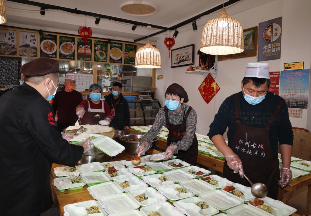 11點(diǎn)30分,50余份香噴噴的米飯和燉羊肉已經(jīng)整裝待發(fā)。來自秀容古城袁家村策劃運(yùn)營管理有限公司的張躍凡早已等候多時(shí)。就在昨天,武海軍夫婦聯(lián)系了張躍凡表達(dá)了想要捐贈(zèng)愛心午餐的想法。作為古城運(yùn)營公司綜合部的經(jīng)理,張躍凡在第一時(shí)間與秀容街道辦事處取得了聯(lián)系。盡管疫情發(fā)生以來,張躍凡和古城運(yùn)營公司已為很多防疫站點(diǎn)捐送了物資,但疫情防控“壓實(shí)壓細(xì)”的要求使他意識(shí)到必須保證每一份物資能安全、精準(zhǔn)分配到位。為此,在聯(lián)系好受贈(zèng)點(diǎn)后,張躍凡早早就等在了武海軍夫婦的店里,清點(diǎn)數(shù)量,保證質(zhì)量,使愛心午餐能準(zhǔn)時(shí)保質(zhì)送達(dá)。