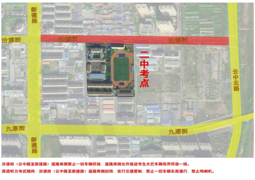 英語聽力考試期間,汾源街(云中路至開發(fā)西街南二巷)道路兩側(cè)封閉,實行交通管制,禁止一切車輛東西通行,禁止鳴喇叭。