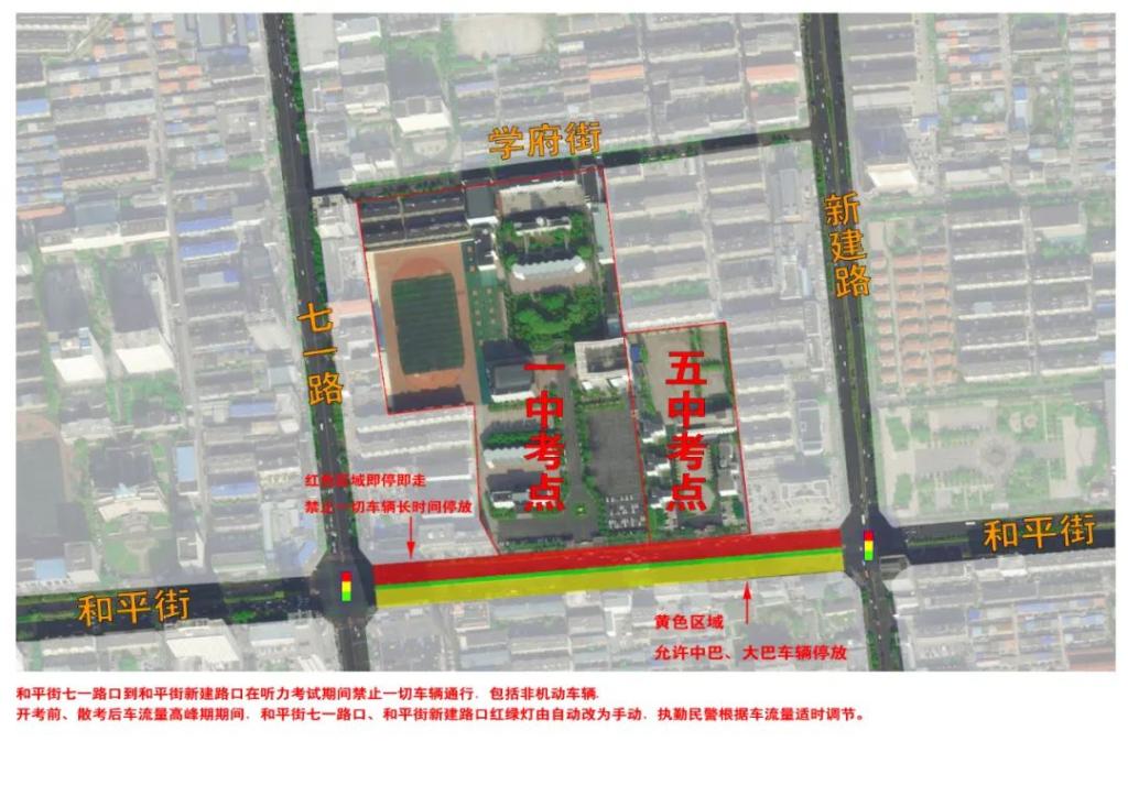 英語聽力考試期間,和平街(七一路至新建路)道路兩側(cè)封閉,實行交通管制,禁止一切車輛東西通行,禁止鳴喇叭。