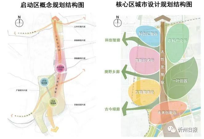 一葉知秋:保留基本農(nóng)田;三廊共生:三條城野綠廊;一脈相通:太忻發(fā)展脈絡(luò);五谷豐登:五大功能組團(tuán),分別為未來創(chuàng)新谷、科創(chuàng)匯智谷、高新技術(shù)谷、農(nóng)科產(chǎn)業(yè)谷、互聯(lián)聚落谷。規(guī)劃設(shè)計(jì)充分考慮核心區(qū)與忻州老城從空間到歷史文脈的銜接,同時(shí)采用組團(tuán)式發(fā)展布局,為城區(qū)發(fā)展留有充足彈性空間。