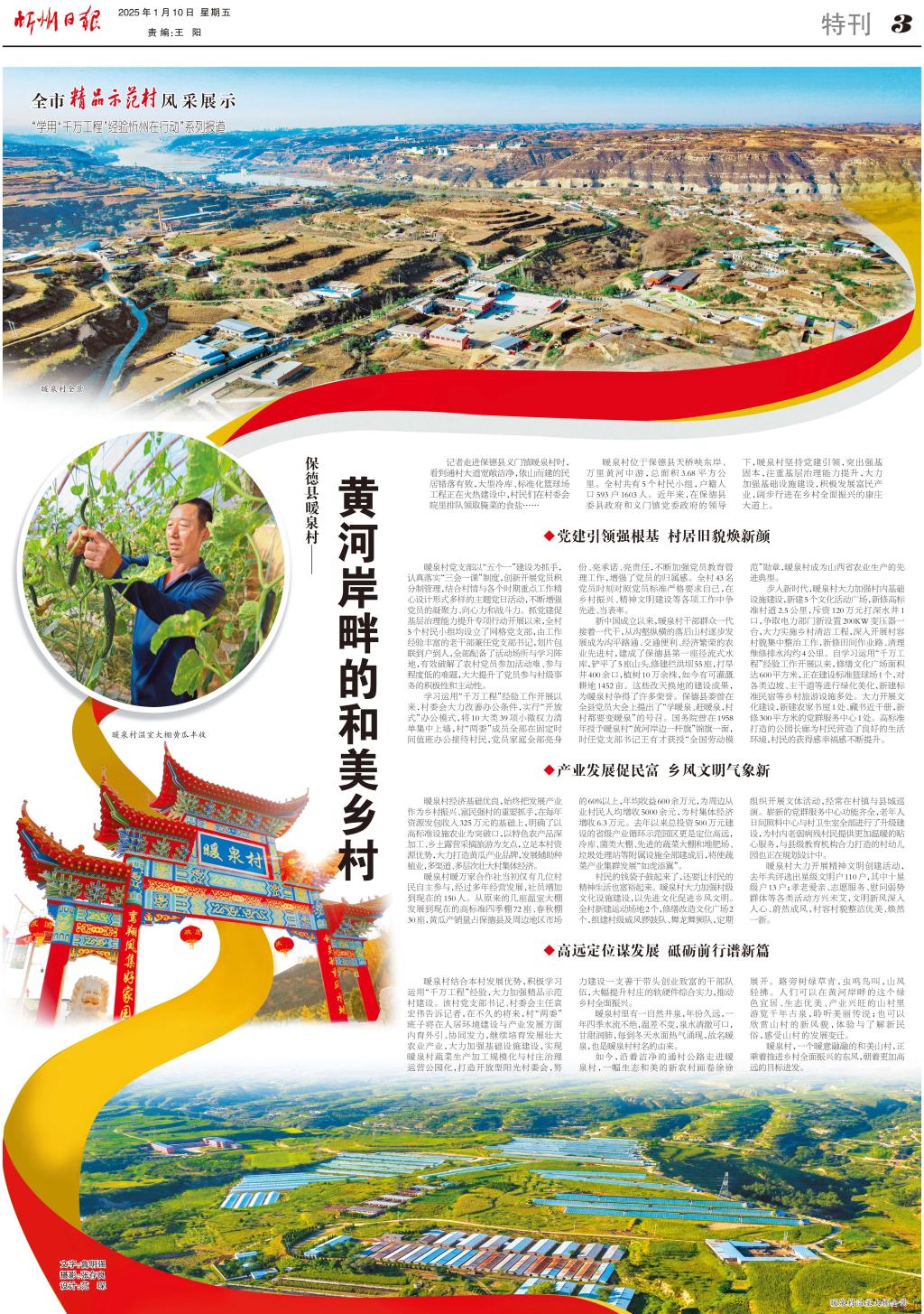 如今,沿著潔凈的通村公路走進(jìn)暖泉村,一幅生態(tài)和美的新農(nóng)村畫卷徐徐展開(kāi)。路旁樹綠草青,蟲鳴鳥叫,山風(fēng)輕拂。人們可以在黃河岸畔的這個(gè)綠色宜居、生態(tài)優(yōu)美、產(chǎn)業(yè)興旺的山村里游覽千年古泉,聆聽(tīng)美麗傳說(shuō);也可以欣賞山村的新風(fēng)貌,體驗(yàn)與了解新民俗,感受山村的發(fā)展變遷。
