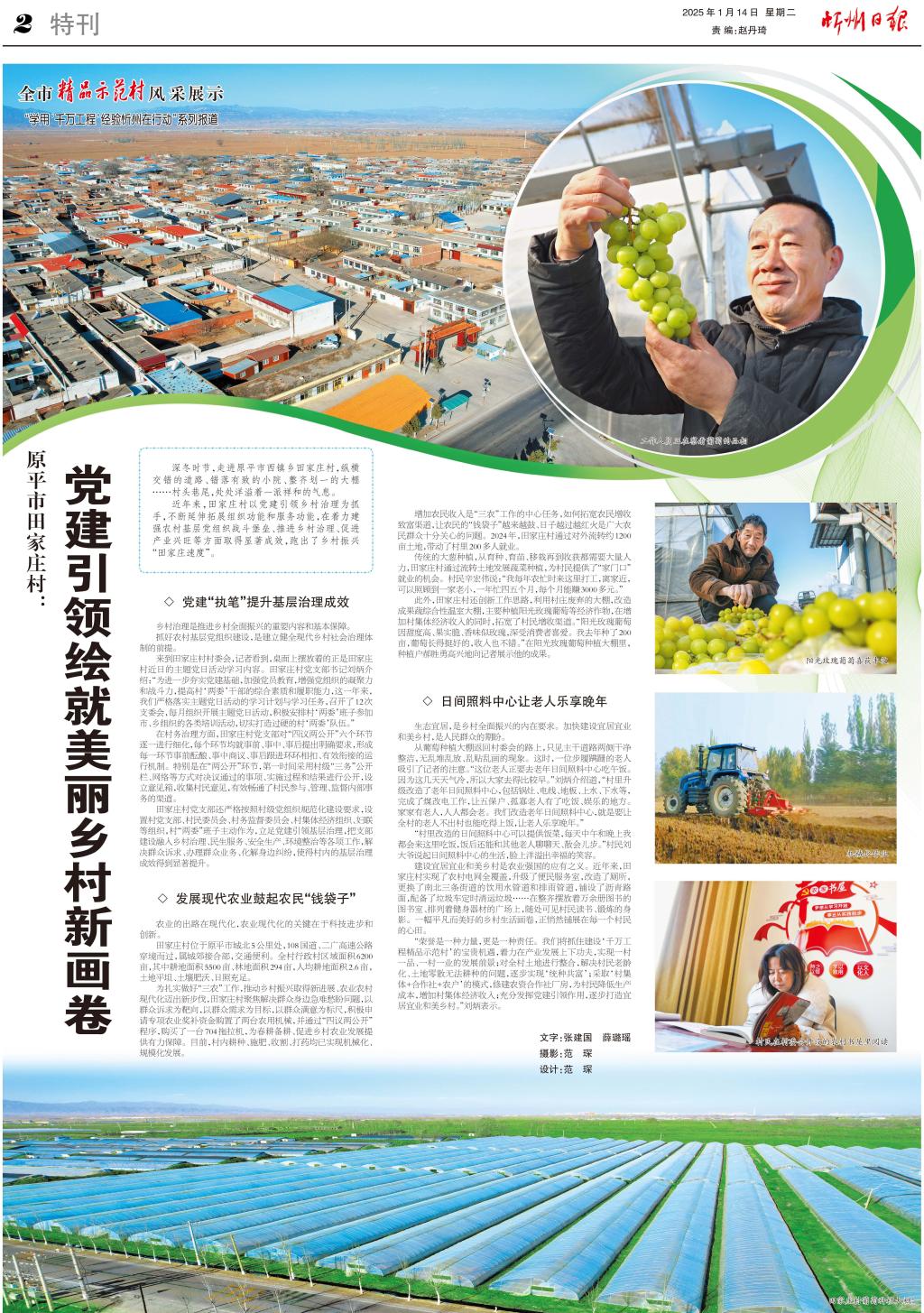 此外,田家莊村還創(chuàng)新工作思路,利用村莊廢棄的大棚,改造成果蔬綜合性溫室大棚,主要種植陽(yáng)光玫瑰葡萄等經(jīng)濟(jì)作物,在增加村集體經(jīng)濟(jì)收入的同時(shí),拓寬了村民增收渠道。“陽(yáng)光玫瑰葡萄因甜度高、果實(shí)脆、香味似玫瑰,深受消費(fèi)者喜愛(ài)。我去年種了200畝,葡萄長(zhǎng)得挺好的,收入也不錯(cuò)?!痹陉?yáng)光玫瑰葡萄種植大棚里,種植戶郝勝勇高興地向記者展示他的成果。