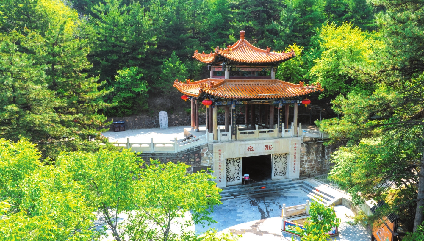 山有水而媚,土得水而沃。從大雄寶殿出來,沿著西門旁一條小道不遠(yuǎn)處,就是那片號稱“天柱松濤”的松林了。只見樹干筆直,枝條蒼勁,直指云霄,林間松脂飄香,氣息悠然。人還在松林中流連尋芳,遠(yuǎn)遠(yuǎn)就能聽到聞名已久的“天柱龍泉”在流淌。龍泉位于景區(qū)廟群西南的龍泉閣,作為“靜樂舊八景”之首的“天柱龍泉”,又名“犬舐泉”,《魏書》載:“爾朱榮高祖羽健居北秀容川。會有狗舐地,因而穿之,得甘泉,故名?!毕鄠魅谐錾颀?,故名龍泉。高山出泉是為奇觀,泉水清澈見底,旱不涸、澇不盈,夏飲清神,冬飲沁心。有“天柱圣境啟心智,龍泉奇觀令神怡”之頌。此泉水富含多種礦物質(zhì)和微量元素,是地地道道的“天然級礦泉水”。近幾年上山鍛煉的居民很多,人們上山時自帶裝水工具,攜泉水以做飯和飲用,期盼著龍泉水能給人帶來健康和好運。站在龍泉邊,總能感受到一陣陣濕潤的水氣撲面而來,甚至像風(fēng)一樣輕繞著周身,使人置身于自然美景中不愿離開,連呼吸也變得無比暢快起來。