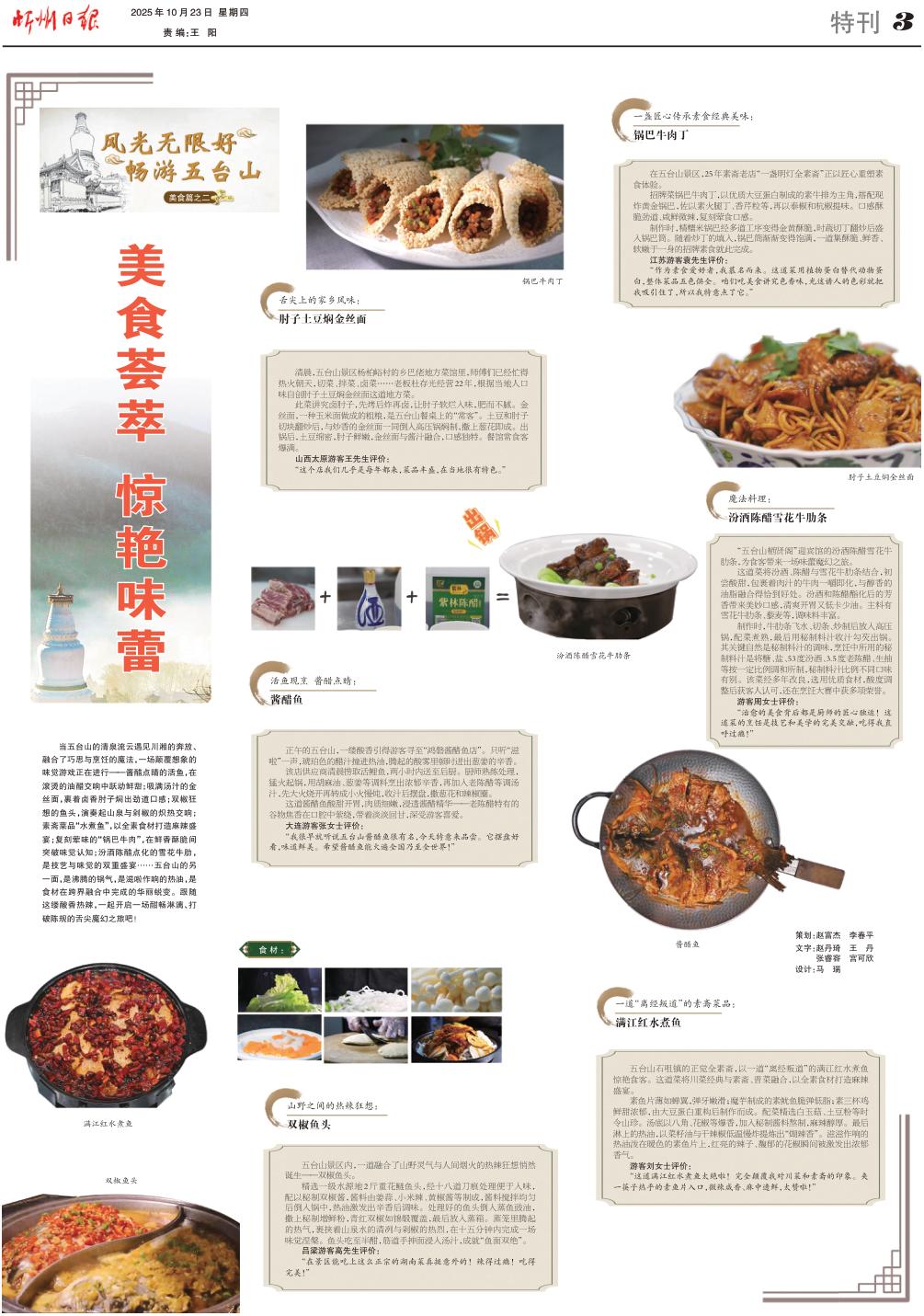 當(dāng)五臺山的清泉流云遇見川湘的奔放、融合了巧思與烹飪的魔法,一場顛覆想象的味覺游戲正在進(jìn)行——醬醋點(diǎn)睛的活魚,在滾燙的油醋交響中躍動鮮甜;吸滿湯汁的金絲面,裹著鹵香肘子燜出勁道口感;雙椒狂想的魚頭,演奏起山泉與剁椒的熾熱交響;素齋菜品“水煮魚”,以全素食材打造麻辣盛宴;復(fù)刻葷味的“鍋巴牛肉”,在鮮香酥脆間突破味覺認(rèn)知;汾酒陳醋點(diǎn)化的雪花牛肋,是技藝與味覺的雙重盛宴……五臺山的另一面,是沸騰的鍋氣,是滋啦作響的熱油,是食材在跨界融合中完成的華麗蛻變。跟隨這縷酸香熱辣,一起開啟一場酣暢淋漓、打破陳規(guī)的舌尖魔幻之旅吧!