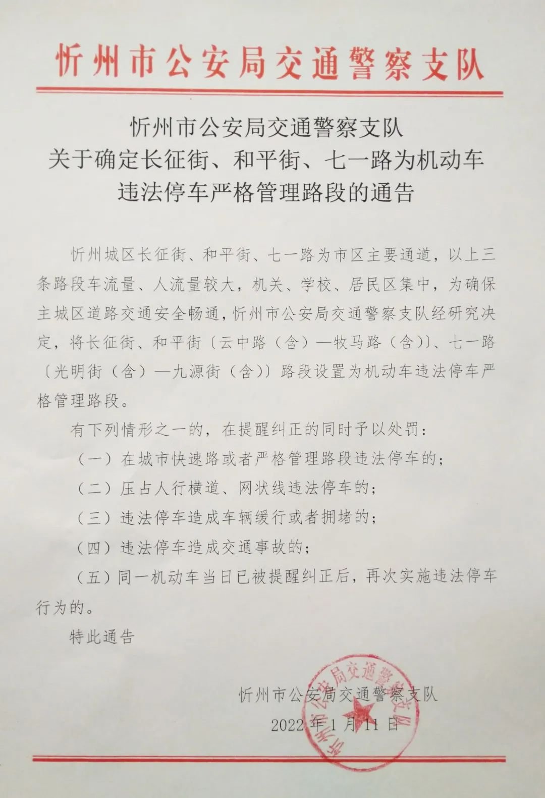 忻州城區(qū)長征街、和平街、七一路為市區(qū)主要通道,以上三條路段車流量、人流量較大,機關、學校、居民區(qū)集中,為確保主城區(qū)道路交通安全暢通,忻州市公安局交通警察支隊經(jīng)研究決定,將長征街、和平街[云中路(含)-牧馬路(含)]、七一路[光明街(含)-九原街(含)]路段設置為機動車違法停車嚴格管理路段。