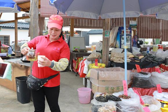 “天太熱,來(lái)喝口我這免費(fèi)的茶?!辈湃脒B樟村村口,記者便被熱情的村民陸秀媚招呼到了自己的攤位。紅茶、本地枝葉、山柑皮、筍干……她的攤位琳瑯滿目,擺得滿滿當(dāng)當(dāng)。陸秀媚告訴記者,自己曾經(jīng)在市里賣童裝,剛開(kāi)始還能掙到些錢,后來(lái)隨著網(wǎng)購(gòu)興起,實(shí)體店的生意越來(lái)越難做。2018年,在習(xí)近平總書記來(lái)連樟村視察后,看到家鄉(xiāng)越變?cè)胶茫懶忝倪x擇了回到村里創(chuàng)業(yè)。