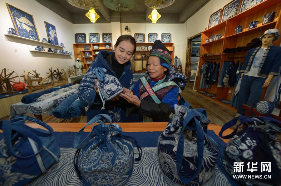 12月1日,在丹寨縣金泉街道千年傳蠟染制作坊,店員和易地扶貧搬遷村民在欣賞蠟染畫手工藝成品。新華社記者 楊楹 攝