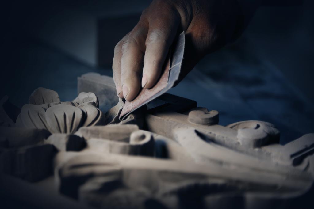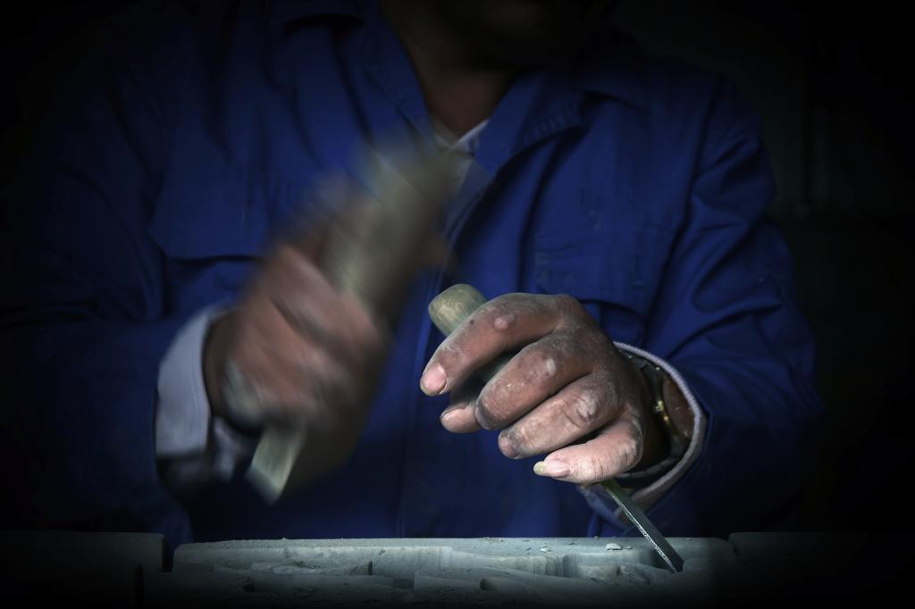 雕前先“打樣”:把設(shè)計稿拓印在涂抹過石灰水的磚面上,或者在磚塊上直接描畫?,F(xiàn)在許多外地磚雕加工廠多用電腦打樣,生產(chǎn)出來的是“制式”產(chǎn)品,千篇一律。磚雕常用的圖案王鎖貴早已爛熟于心,想要的圖案在青磚上一揮而就,當真是“鐵劃銀鉤”、揮灑自如。如此,則構(gòu)圖更加生動,細節(jié)更加充盈,最主要的是絕不雷同。接下來“打坯”:用鑿子或刻刀粗略勾勒畫面輪廓,分出基本層次。最后是“出細”:運用多種工具,或鏟、或刻、或挑,以刻畫細節(jié)。