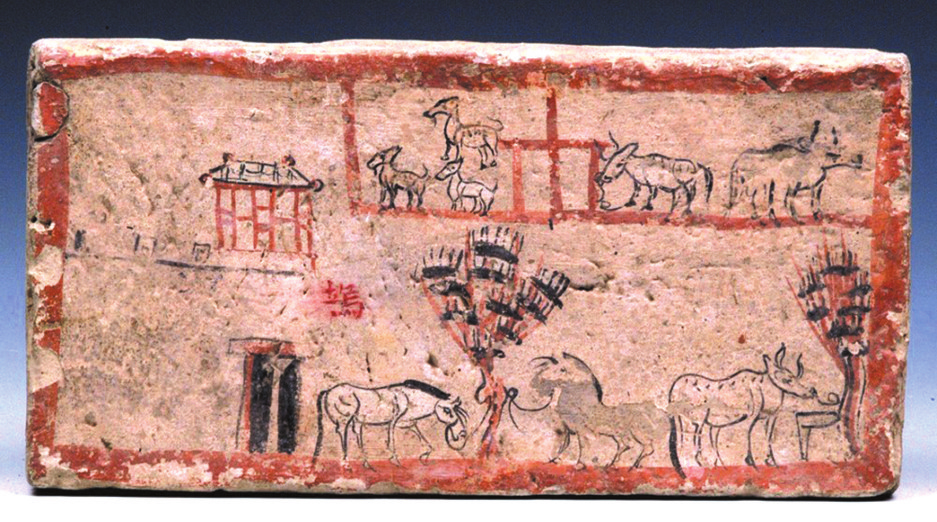 塢壁是東漢時(shí)期極具特色的建筑,由于當(dāng)時(shí)地方豪強(qiáng)勢(shì)力急速發(fā)展,廣泛兼并土地,蔭庇宗族與賓客,形成自己的武裝與生產(chǎn)力量,逐漸出現(xiàn)了塢、屯、壁、堡、壘、營(yíng)、寨等集生產(chǎn)、生活、軍事為一體的建筑,閉門成市,后來在魏晉時(shí)期發(fā)揚(yáng)光大。嘉峪關(guān)長(zhǎng)城博物館藏的一塊畫像磚,磚面左側(cè)繪一小城,城墻上筑雉堞,城門上建譙樓,榜題“塢”字,塢外繪有兩株樹,還有一群牛馬羊在悠閑吃草,形象再現(xiàn)了塢的建筑形制。