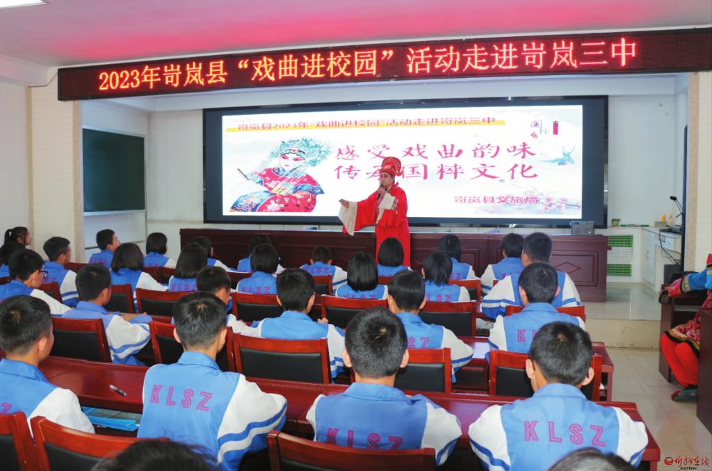 “樊梨花她好比鮮花一樣,練就了一套套飛龍花槍……”67歲的岢嵐縣晉劇團退休演員王潤花給岢嵐三中的同學們演繹晉劇《樊梨花》片斷,圓潤的唱腔加上演員的專業(yè)表演,引來臺下學生們的嘖嘖贊嘆;53歲的本土二人臺演員王藝文表演的《探親》選段,更是以生動、詼諧的表演和極富地方生活氣息的臺詞讓同學們投去欽佩的目光……當演員們表示要現場教大家“比劃”時,同學們爭相上臺跟著學起來。這是近日岢嵐縣2023年“戲曲進校園”活動走進岢嵐三中的場景。