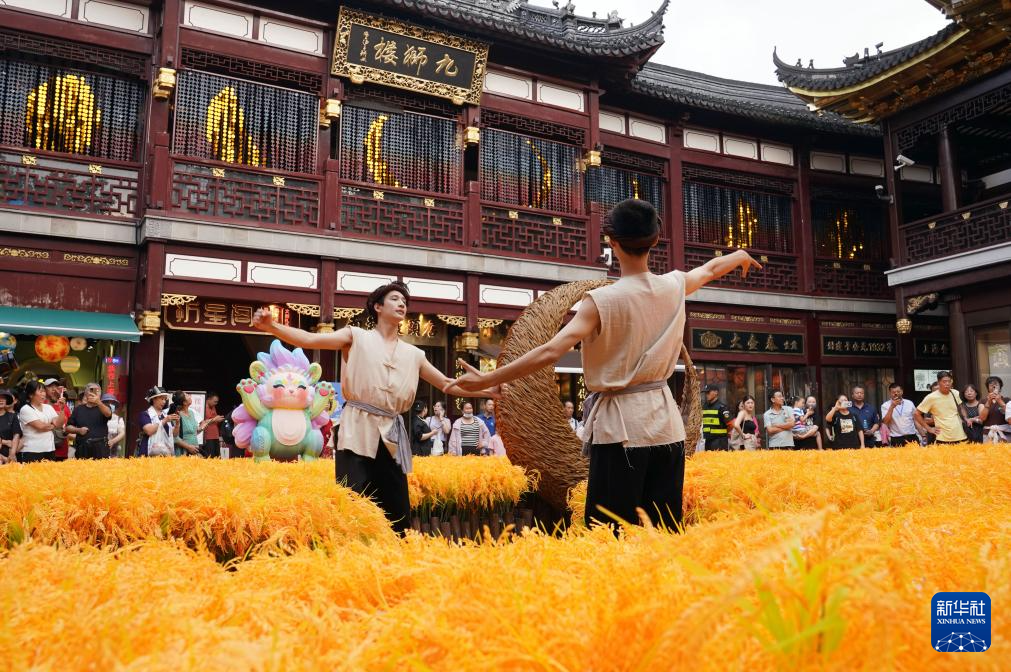 9月17日,游客在豫園商城“豐收的麥田”場景中,欣賞演員表演豐收舞。