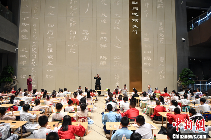 圖為9月7日,小朋友們在位于甘肅蘭州的甘肅簡牘博物館學(xué)習(xí)書寫簡牘中的文字。中新社記者 九美旦增 攝