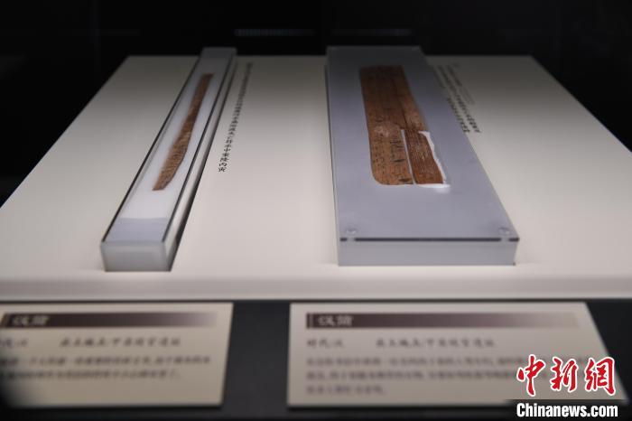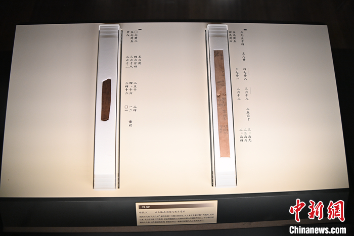 圖為9月7日,甘肅蘭州,甘肅簡牘博物館里展出敦煌馬圈灣遺址出土的漢簡“九九之?dāng)?shù)”。中新社記者 九美旦增 攝
