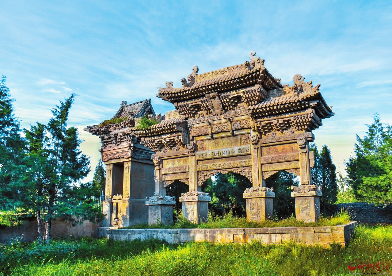 坐落于村中的朱氏牌樓是晚清中儀大夫、陜西延榆綏兵道加鹽運(yùn)使武訪疇為其母所修的節(jié)孝牌坊。它不僅見證了朱氏家族的輝煌歷史,也反映了當(dāng)時(shí)社會的文化風(fēng)貌,承載著豐富的歷史文化內(nèi)涵,為第八批全國重點(diǎn)文物保護(hù)單位。牌樓有主坊和配坊兩座,主坊矗立在村內(nèi)南街,面寬三間,四柱三樓,重檐歇山頂,高近11米、寬15米。欄板內(nèi)剔底雕刻成一幅幅人物故事圖案,霸王柱間鏤雕丹鳳朝陽。匾形走馬板上書“柏舟矢志”“竹柏流芳”各四字。牌坊下檐明間置匾一塊,書“圣旨”二字,兩次間匾書分別為“懿范”“徽音”。配坊在村南,高8米有余,四柱三門,單檐歇山頂,規(guī)模略小,造型風(fēng)格與主坊一樣,皆為石雕藝術(shù)精品。