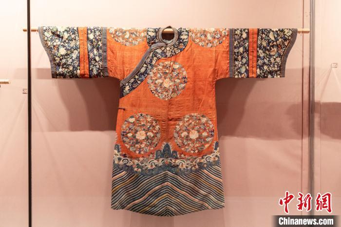 “這件吉服袍是清代滿漢服飾文化交融的重要見證:滿族作為北方游牧民族,為適應(yīng)騎射之需,其傳統(tǒng)袍服多為‘緊身窄袖’樣式,清代中后期,受到漢族女裝寬身博袖造型影響,滿族宮廷女性吉服袍的袖筒及馬蹄袖口變得更加肥闊?!碧镙x說。
