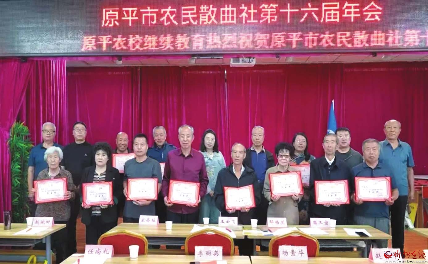 散曲社朗誦部的曲友們?cè)谟茡P(yáng)音樂聲中,激情澎湃地朗誦著五谷飄香的農(nóng)民散曲,20多名優(yōu)秀社員受到表彰,展示出原平農(nóng)民散曲的喜慶豐收景象?!霸娙绯保r(nóng)民種曲名聲在,情如火,南腔北調(diào)心澎湃。曲如海,同舟共濟(jì)承傳愛,暖如春,一年四季花不敗。花開滿地鮮,曲韻熔天籟,好一個(gè)震驚曲界田園派?!边@首散曲《正宮·塞鴻秋》道出了散曲社社員們的心聲。