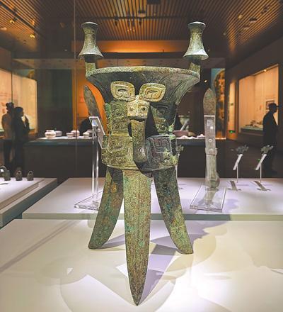 殷墟博物館與殷墟宗廟宮殿區(qū)隔河相望,是全景式展現(xiàn)商文明的國(guó)家重大考古專題博物館。圖為殷墟博物館里展出的殷墟婦好墓出土的銅斝。