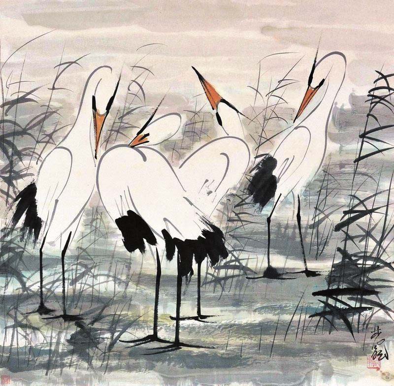 到了近現(xiàn)代,傳統(tǒng)文藝思想開(kāi)始發(fā)生轉(zhuǎn)變,呂澂、康有為等人在繪畫(huà)領(lǐng)域提出改良思想,鶴主題的繪畫(huà)也有所變化。在林風(fēng)眠創(chuàng)作的《群鶴圖》《雙鶴圖》《白鶴》等作品中,既可以看到中國(guó)畫(huà)白描的影子,又可以感受到西方速寫(xiě)技法的影響?!度胡Q圖》由幾只立于廣袤水草的白鶴構(gòu)成,它們姿態(tài)各不相同。與鶴之閑適姿態(tài)相對(duì)應(yīng)的是隨風(fēng)浮動(dòng)的蘆葦,它們?cè)谖L(fēng)吹拂下雖形態(tài)萬(wàn)千,但并不雜亂,在總體偏暗的色調(diào)中顯出和諧之味。《雙鶴圖》表現(xiàn)了鶴的輕盈姿態(tài),兩只鶴步伐保持一致,展示出閑適自得之感。林風(fēng)眠筆下的鶴,顯然沒(méi)有古代繪畫(huà)中仙風(fēng)道骨、富貴長(zhǎng)壽之意,與寫(xiě)意之鶴相比,其作品里的鶴與自然萬(wàn)物融為一體,表達(dá)出強(qiáng)有力的現(xiàn)代語(yǔ)言。