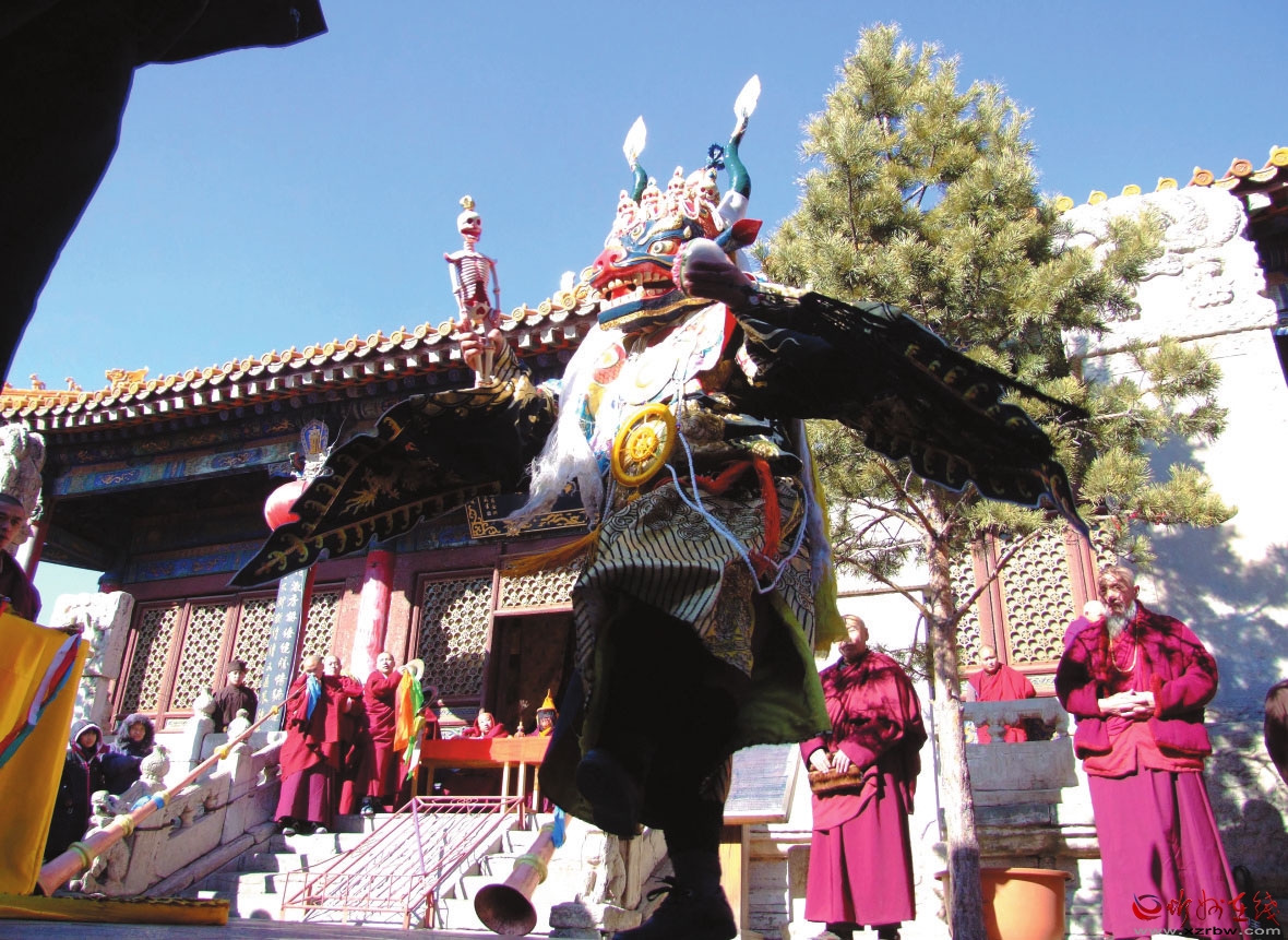 這種舞蹈活動一年舉行一次,每年陰歷六月十四開始,歷時3天,在菩薩頂、羅睺寺舉行。舞者多為寺內(nèi)僧人,頭戴象征佛、菩薩、護(hù)法神的猙獰面具(如大威德金剛、吉祥天母),身著華麗法衣,手持法器(金剛杵、顱碗等)。舞蹈動作剛勁有力,配合鼓、鈸等宗教樂器,通過肢體語言演繹降魔、驅(qū)邪、祈福等宗教敘事。