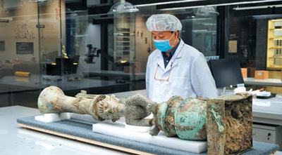 四川省文物考古研究院三星堆遺址工作站站長雷雨在查看拼對成功的鳥足曲身頂尊神像。新華社記者 肖 林?jǐn)z