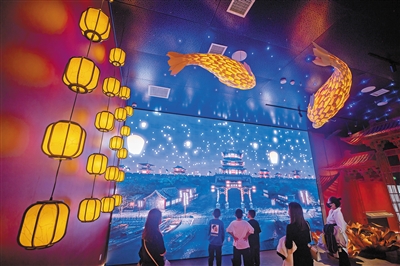 位于北京的瞭倉數(shù)字藏品博物館內(nèi),觀眾在以永定河生態(tài)為主題,展示動態(tài)畫作、實(shí)景照片和人工智能生成畫作的展廳里參觀。新華社記者 陳鐘昊攝