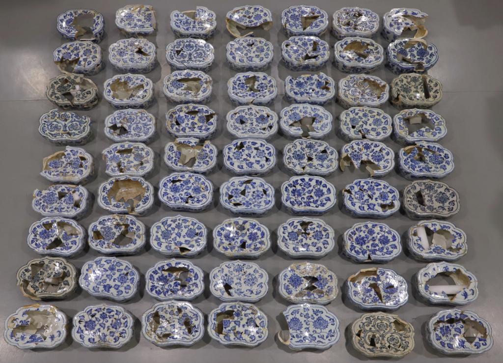 位于江西的景德鎮(zhèn)御窯博物館內(nèi)有一面“網(wǎng)紅墻”,展示了65件明代“空白期”青花瓷枕的修復(fù)件。這些瓷枕曾以碎片的形態(tài)深埋地下十余米數(shù)百年,又在文物修復(fù)師手中重獲新生,成為研究“空白期”官窯瓷器的重要實物依據(jù)。