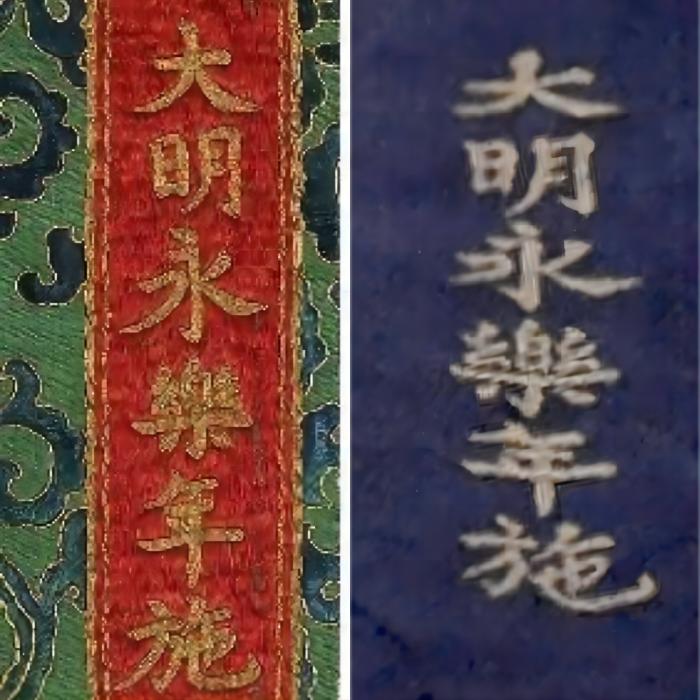 ▲“大明永樂年施”題款對比圖,左側(cè)綠底為永樂御制紅閻摩敵刺繡唐卡,右側(cè)藍(lán)底為明永樂勝樂金剛織錦唐卡。