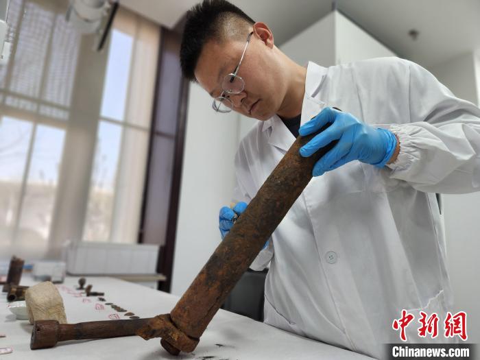 “來(lái)遠(yuǎn)”艦遺址出水的海軍軍刀。山東省水下考古研究中心供圖