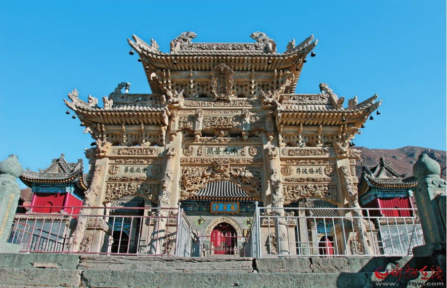 寺中的影壁、牌坊、墓塔是三件藝術(shù)瑰寶。影壁和牌坊與東院處在一條中軸線上,由108級(jí)石板臺(tái)階相連。臺(tái)階底部的照壁,正中所嵌一組漢白玉石雕,可以看作五臺(tái)山風(fēng)景名勝區(qū)主要寺廟的微縮示意圖。而臺(tái)階上面的三門四柱牌坊更為精致壯觀,全部用漢白玉雕造而成,前后垂檐和三門拱券采用鏤空雕法,玲瓏剔透,整個(gè)牌樓雕滿飛龍、花梁、紙扇、寶鏡、書筆、塵撣、玉壺等多種圖案,形象逼真。這座民國年間用10年時(shí)間雕成的牌坊是近代雕刻藝術(shù)的稀世之寶。牌坊后面的東大院前后兩進(jìn),有天王殿、觀音殿、大佛殿等建筑。