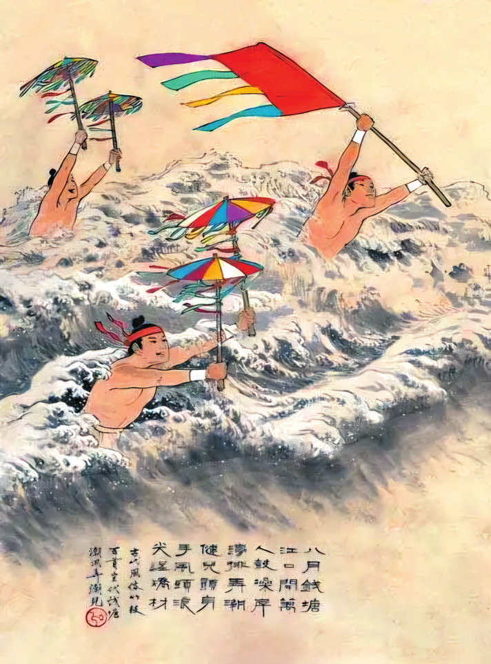 能在大江大河中搏擊風(fēng)浪的游泳好手,被人們尊稱(chēng)為“弄潮兒”。唐人李益曾作閨怨詩(shī)《江南曲》:“嫁得瞿塘賈,朝朝誤妾期。早知潮有信,嫁與弄潮兒。”南宋錢(qián)塘江弄潮是一大盛事,“浙江之潮,天下之偉觀(guān)也”。在“大聲如雷霆,震撼激射,吞天沃日,勢(shì)極雄豪”的潮水中,數(shù)百名弄潮兒“皆披發(fā)文身,手持十幅大彩旗,爭(zhēng)先鼓勇,溯迎而上,出沒(méi)于鯨波萬(wàn)仞中,騰身百變,而旗尾略不沾濕,以此夸能”。辛棄疾夸他們“不怕蛟龍怒。風(fēng)波平步。看紅旆驚飛,跳魚(yú)直上,蹙踏浪花舞”,潘閬更是贊嘆“弄潮兒向濤頭立,手把紅旗旗不濕”。