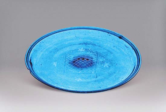 據(jù)地宮出土的物賬碑記載,整個地宮被布置得“窮天上之莊嚴(yán),極人間之煥麗”。在這些文物中,有六件來自阿拉伯國家的刻紋藍玻璃盤。玻璃盤保存完好,為無模吹制成形,通體藍色,晶瑩光潔,盤面刻滿紋飾,主體紋飾為以雙線勾勒出的十字形框架,盤心為正方形方框,方框外刻四個拱門形狀的尖瓣,與中心方框組成四個“米哈拉布”紋樣?!懊坠肌笔且了固m教清真寺大殿的禮拜龕,四個尖瓣內(nèi)各刻一朵五瓣葉子植物紋,尖瓣之間也飾以植物紋。制作工藝是在玻璃成器之后,用比玻璃更堅硬的工具在其表面淺刻花紋,加以描金,從而使得玻璃盤更為華麗。
