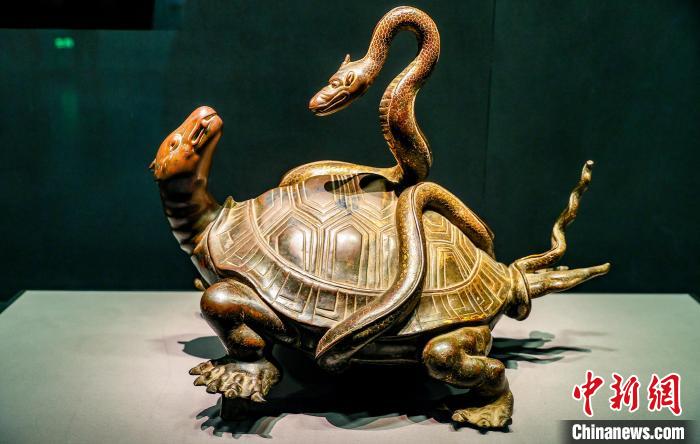 據(jù)介紹,玄武是中國(guó)古代傳說(shuō)中鎮(zhèn)守北方的神獸,往往以龜蛇合體的形象出現(xiàn)。漢代以來(lái),龜蛇作為玄武神的象征受到人們奉祀,后被道教吸收后將其人格化,逐漸成為道教的大神。