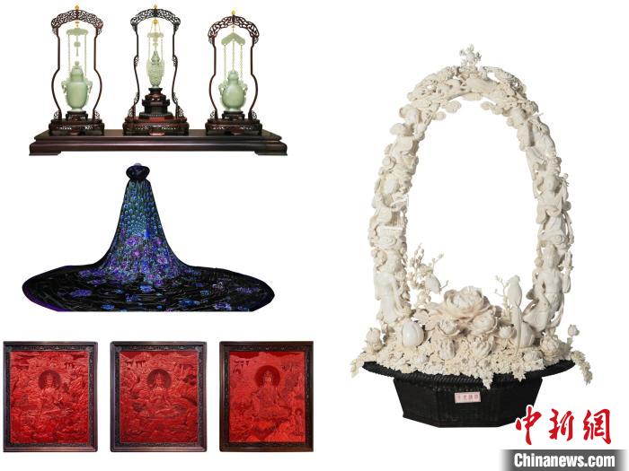 《纏枝蓮紋吊鏈瓶》(玉雕)、《四海升平》(牙雕)、《碧泓云想富貴長天錦繡雀裘》(京繡)和《雕漆剔紅法海寺壁畫》(雕漆)四件作品被認定為北京傳統(tǒng)工藝美術珍品。 主辦方供圖