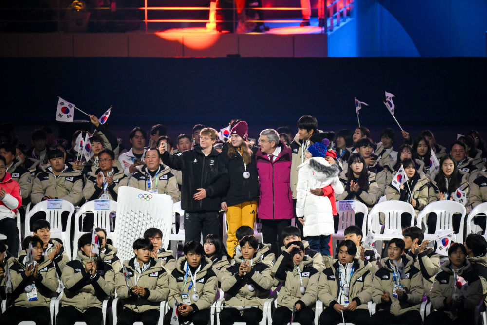 1月19日,國際奧委會主席巴赫在江陵速滑館開幕式現(xiàn)場與運(yùn)動員合影。當(dāng)日,第四屆冬季青年奧林匹克運(yùn)動會開幕式在韓國江原道江陵速滑館和平昌圓頂體育館同時舉行。新華社記者 朱煒 攝