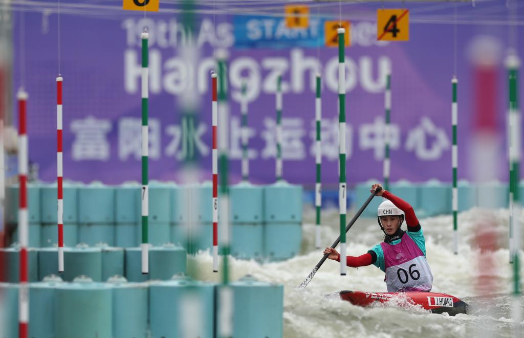 2023年10月7日,杭州亞運(yùn)會(huì)皮劃艇激流回旋項(xiàng)目女子單人劃艇決賽在杭州富陽水上運(yùn)動(dòng)中心舉行,圖為中國選手黃娟在比賽中獲得冠軍。新華社記者 杜瀟逸 攝