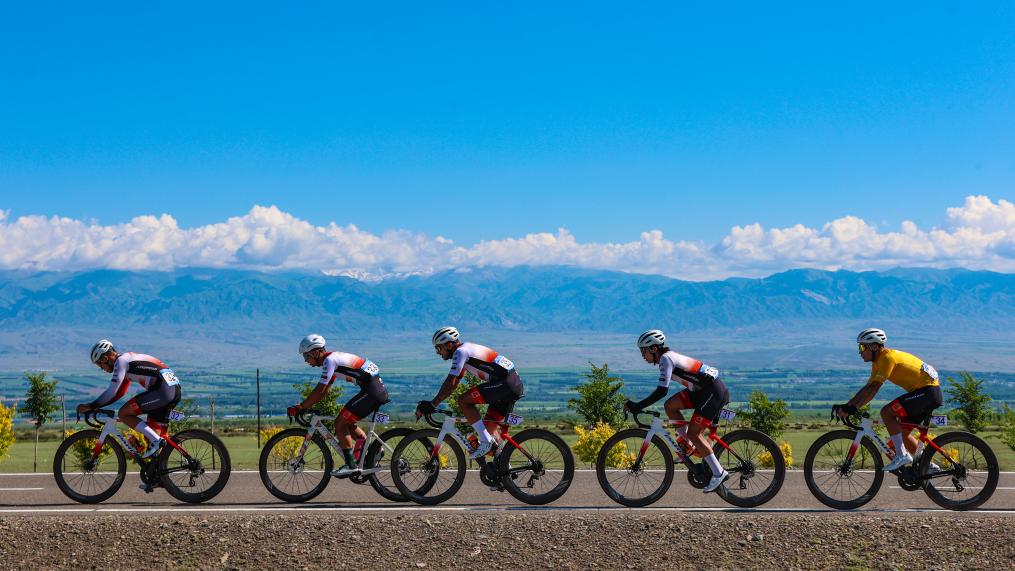 5月30日,第十六屆環(huán)賽里木湖賽第三賽段比賽中,運(yùn)動(dòng)員正在騎行。新華社發(fā)(于蘇甫·艾尼 攝)