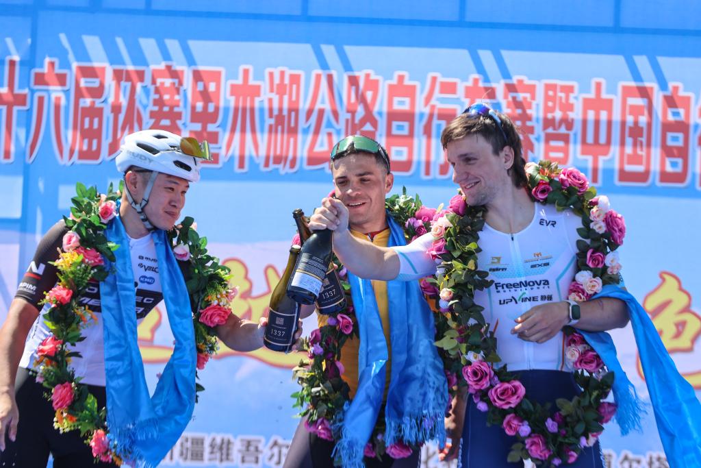 5月30日,第十六屆環(huán)賽里木湖賽第三賽段比賽結(jié)束后,尼古拉斯·馬利尼(右1)與其他獲獎(jiǎng)選手慶祝勝利。新華社發(fā)(于蘇甫·艾尼 攝)