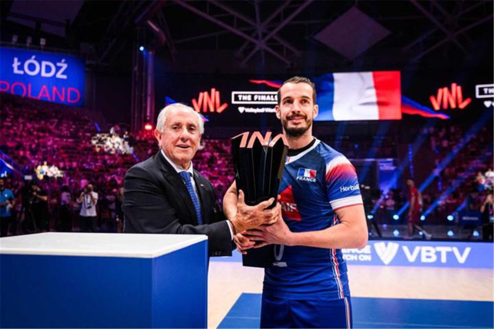 法國排球國家隊隊長本杰明·托紐蒂上臺領(lǐng)取獎杯,圖片來自FIVB國際排聯(lián)官網(wǎng)。