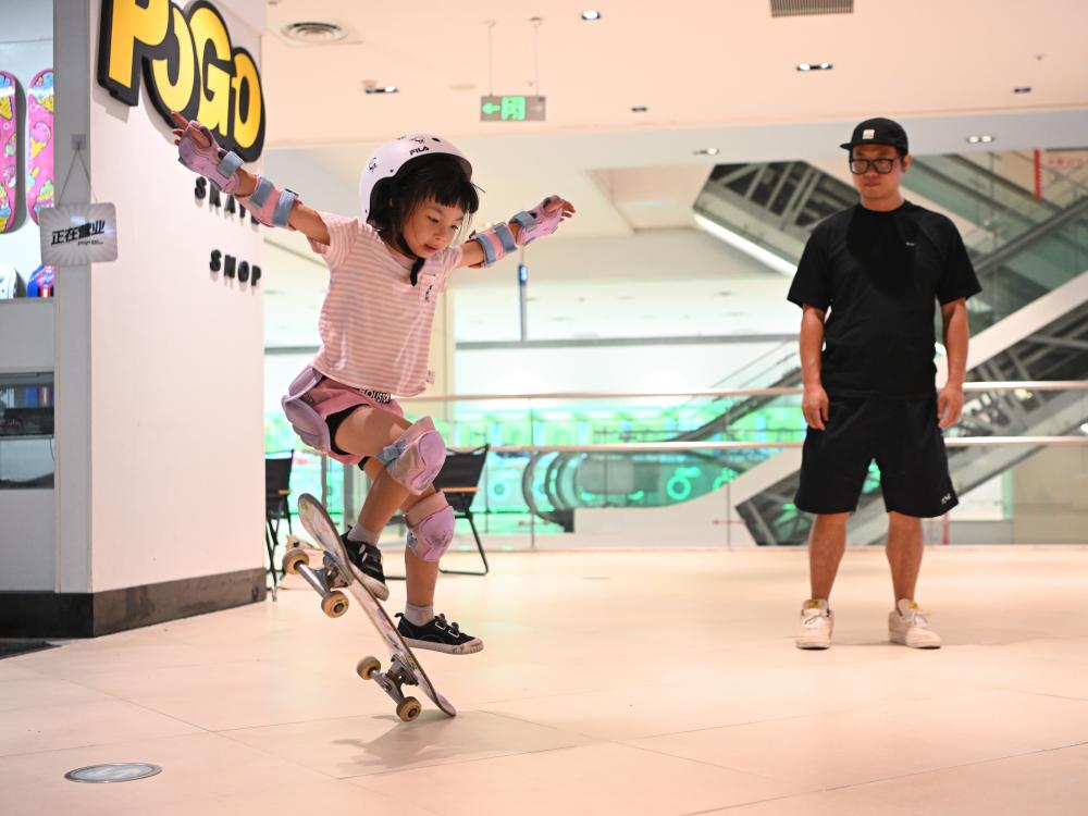 7月17日,閤偉峰正在看女兒閤靈暄(左)練習(xí)滑板。新華社記者 王曦 攝