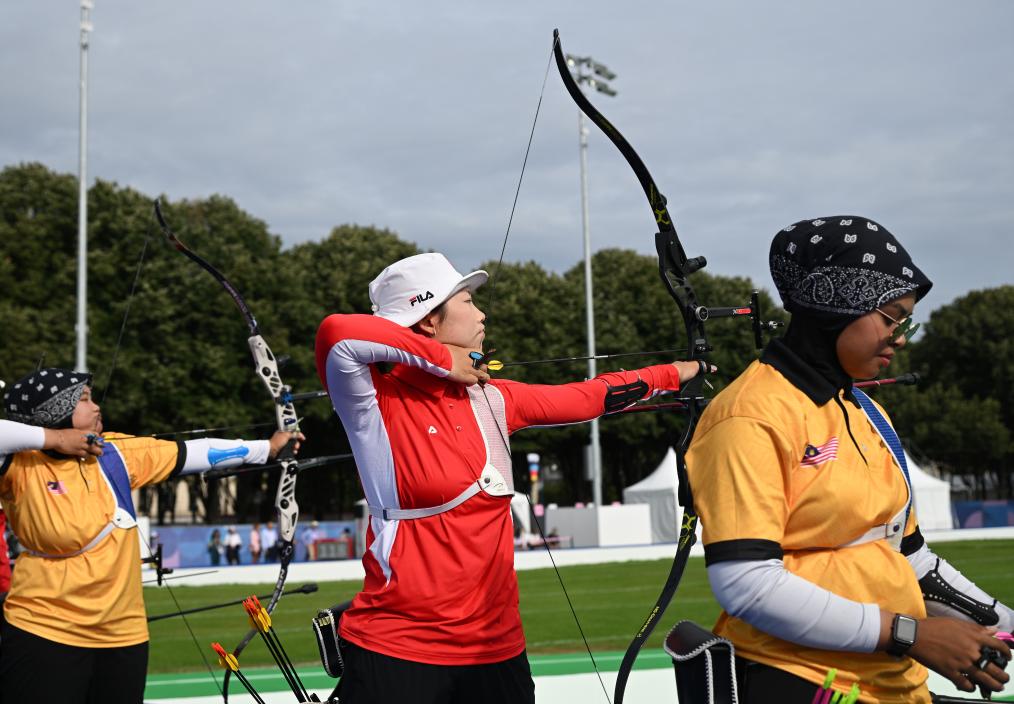 7月25日,巴黎奧運(yùn)會(huì)射箭女子個(gè)人排位賽在巴黎榮軍院舉行,中國選手楊曉蕾(中)在比賽中。新華社記者 賀燦鈴 攝