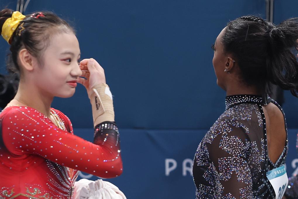 7月28日,美國選手拜爾斯(右)與中國選手邱祺緣在轉(zhuǎn)換項(xiàng)目。當(dāng)日,巴黎奧運(yùn)會(huì)體操女子資格賽在貝爾西體育館舉行。 新華社記者 曹燦 攝