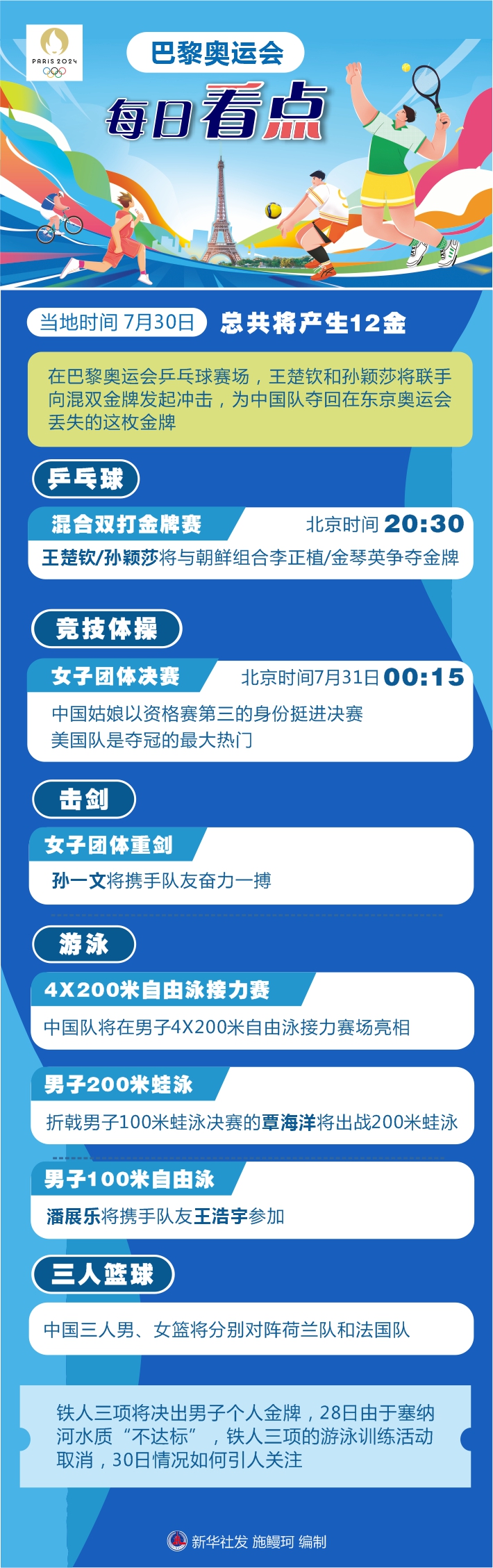 還有一些項(xiàng)目將拉開戰(zhàn)幕。中國三人男、女籃將分別對陣荷蘭隊(duì)和法國隊(duì)。鐵人三項(xiàng)將決出男子個(gè)人金牌,28日由于塞納河水質(zhì)“不達(dá)標(biāo)”,鐵人三項(xiàng)的游泳訓(xùn)練活動(dòng)取消,30日情況如何引人關(guān)注。