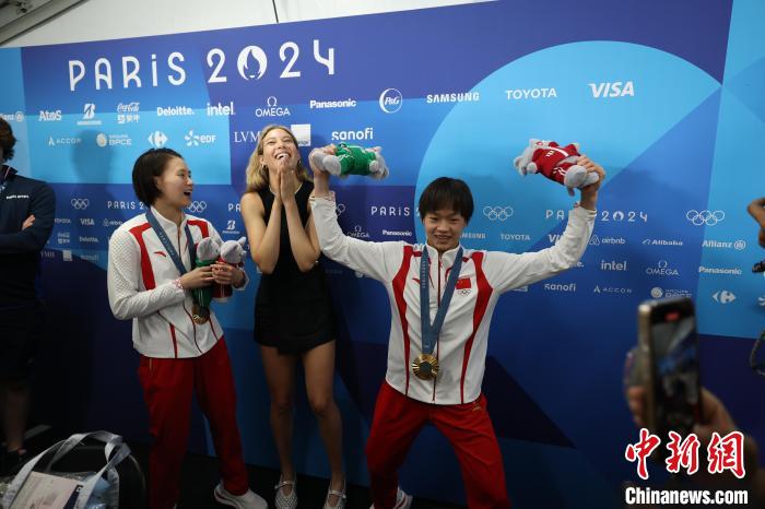 當地時間7月31日,在巴黎奧運會跳水女子雙人10米臺項目中,中國隊組合陳芋汐/全紅嬋獲得冠軍。谷愛凌(中)在賽后化身粉絲與陳芋汐(左)、全紅嬋合影。 中新社記者 富田 攝