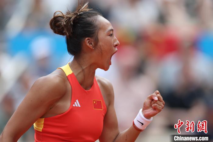 當地時間8月3日,在巴黎奧運會網球女子單打比賽中,中國選手鄭欽文2:0勝克羅地亞選手維基奇,獲得金牌。圖為鄭欽文在比賽中。 中新社記者 富田 攝