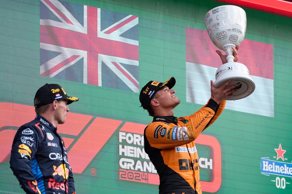 當(dāng)天,諾里斯桿位發(fā)車,但在第一圈1號彎之后丟掉位置,被主場作戰(zhàn)的維斯塔潘超越。隨著比賽進行,諾里斯不斷嘗試反超,最終在第18圈實現(xiàn)了超越,開始領(lǐng)跑。第24圈時,處在第二位的維斯塔潘告訴車隊,自己的賽車無法進一步提速,當(dāng)時他已經(jīng)被諾里斯甩開將近4秒。最終諾里斯從容領(lǐng)跑至比賽結(jié)束,并在最后一圈拿下最快圈速。
