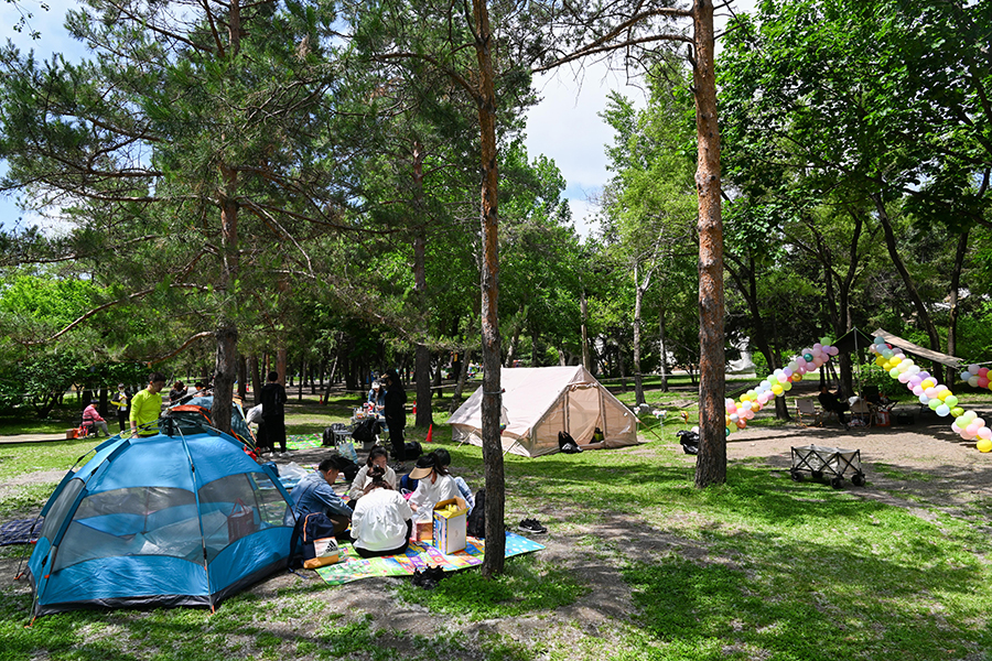 圖為6月4日拍攝的游人在太陽島風(fēng)景區(qū)的露營區(qū)體驗(yàn)游玩。新華社發(fā)