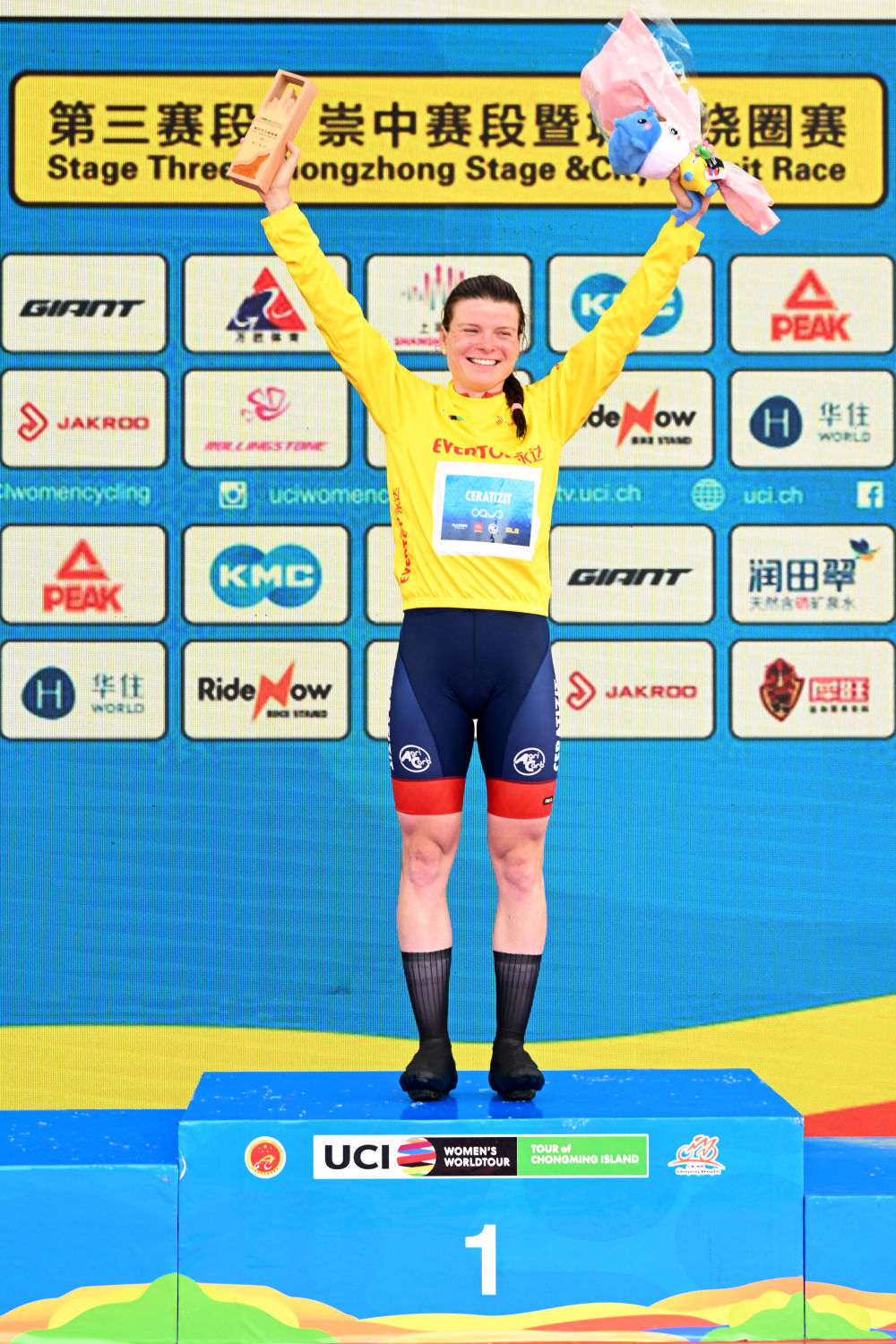 10月17日,冠軍森拉天時-WNT女子職業(yè)車隊選手瑪爾塔·拉赫在頒獎儀式上。新華社發(fā)(陳浩明攝)