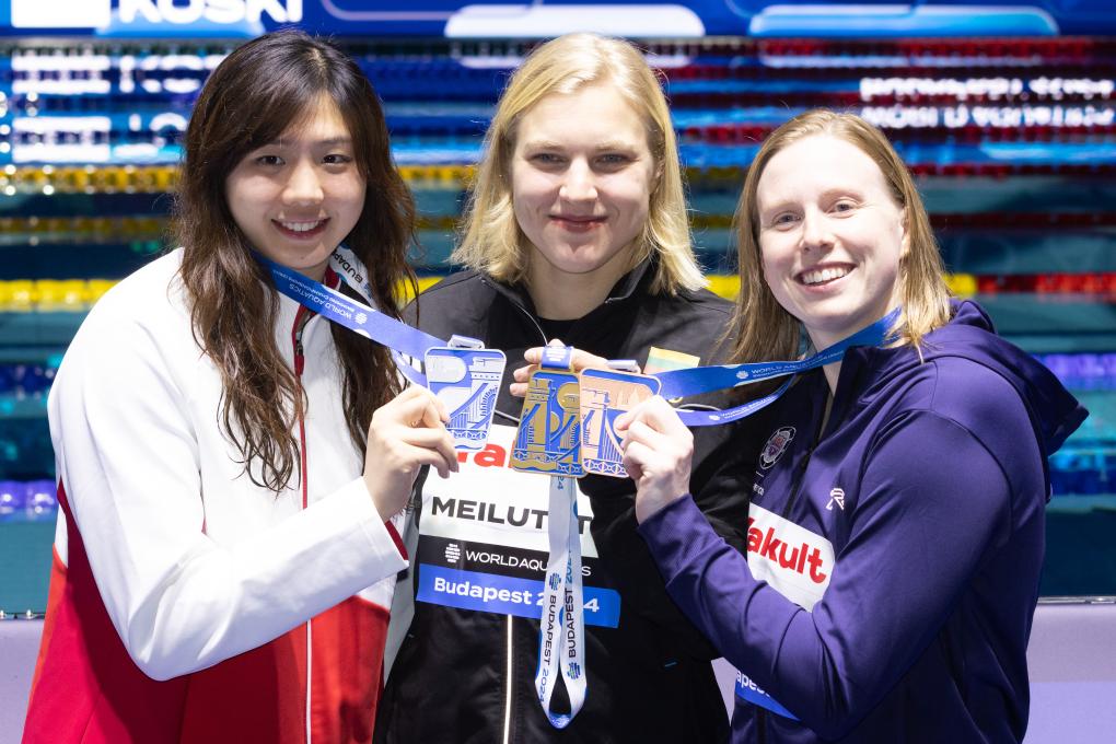 20歲的中國蛙泳名將唐錢婷不需要“求助”其他獲獎運動員,自己就完成了三枚獎牌的拼接。