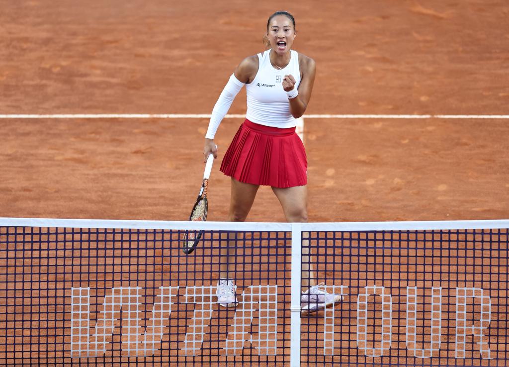 本場比賽,鄭欽文多次通過放小球得分?!拔铱吹綄κ忠恢蓖笸?,所以我希望打亂一下她的節(jié)奏。我也看到對手的腳步不是很快,我覺得在紅土場上,放小球是一個比較有力的武器?!?/p>